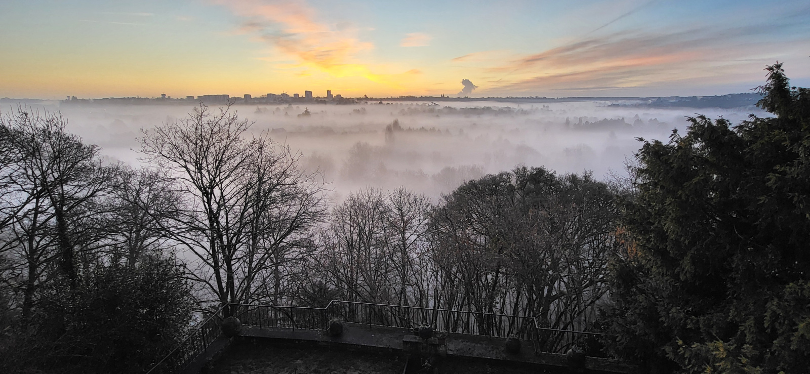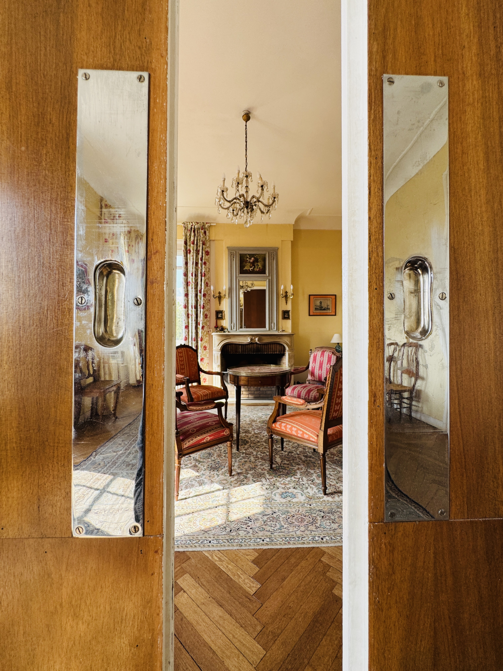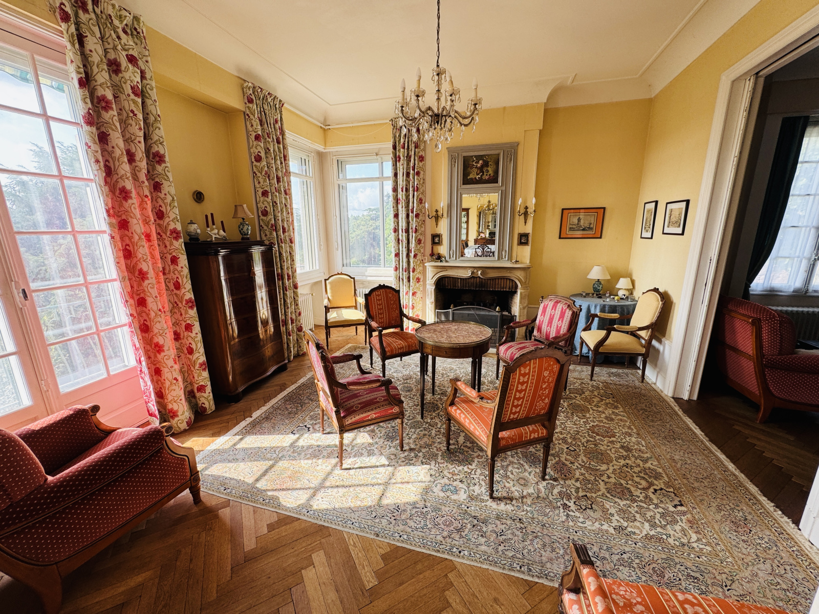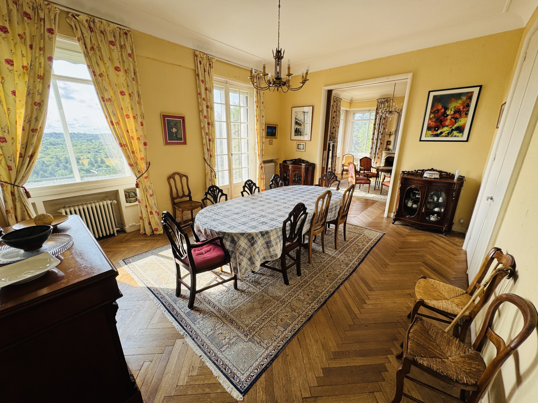 Premier étage = un grand palier éclairé par un puits de jour mettant en valeur le grand escalier avec de très jolis éléménts architecturaux, puis 62m² de pièces de réception en enfilade sur parquet en point de Hongrie dont une salle à manger ouvrant sur la coursive-terrasse dominant à 180 degrès toute la vallée du Clain, et à la suite, un salon avec cheminée puis un deuxième salon. Pièces séparables par de magnifiques portes en bois à galandage d'époque. Hauteur sous plafond de 3,28 mètres. Une cuisine aménagée et son office de rangement donnant sur une véranda avec accès jardin. WC