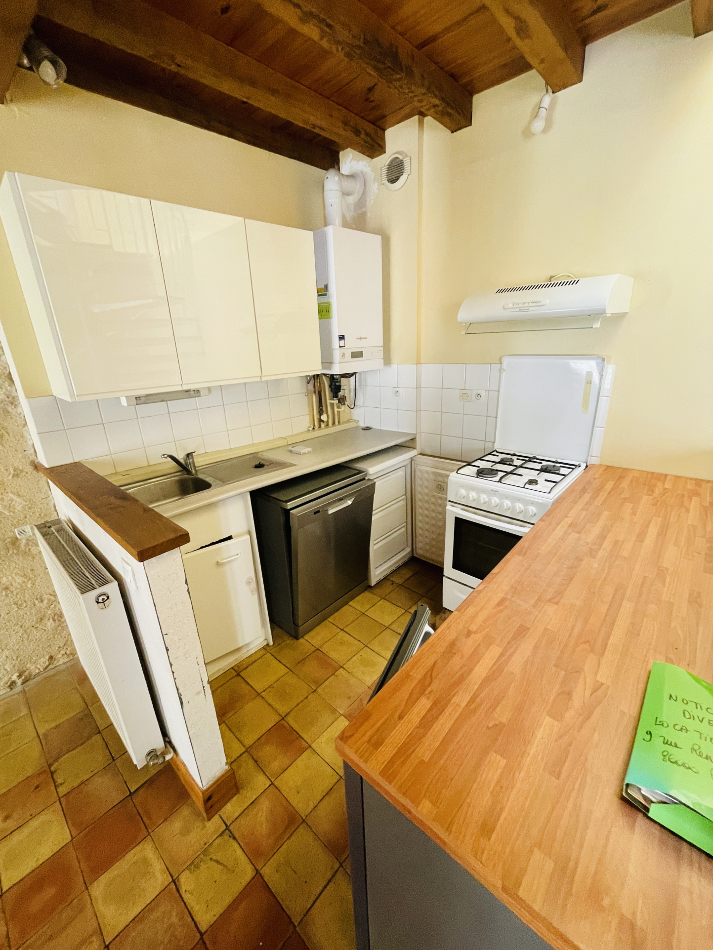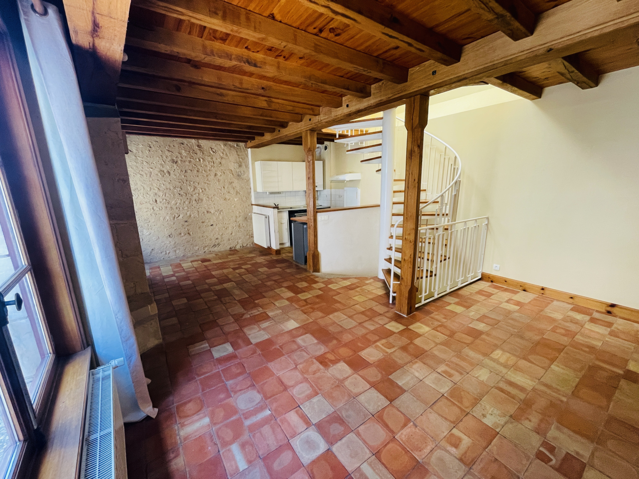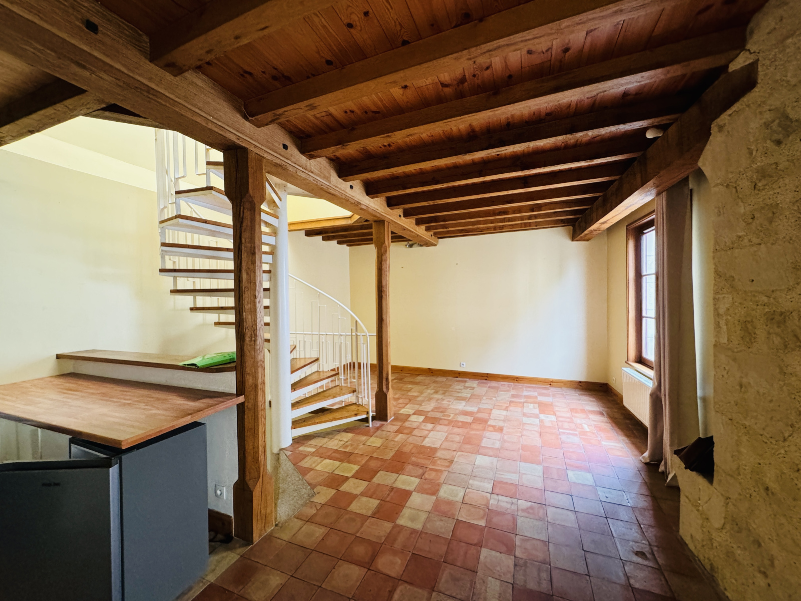 Au premier étage un séjour plein de charme de 30m² sur tomettes anciennes avec un coin cuisine entièrement équipé et aménagé (gazinière, lave-vaisselle, réfrigérateur et congélateur inclus dans la vente).