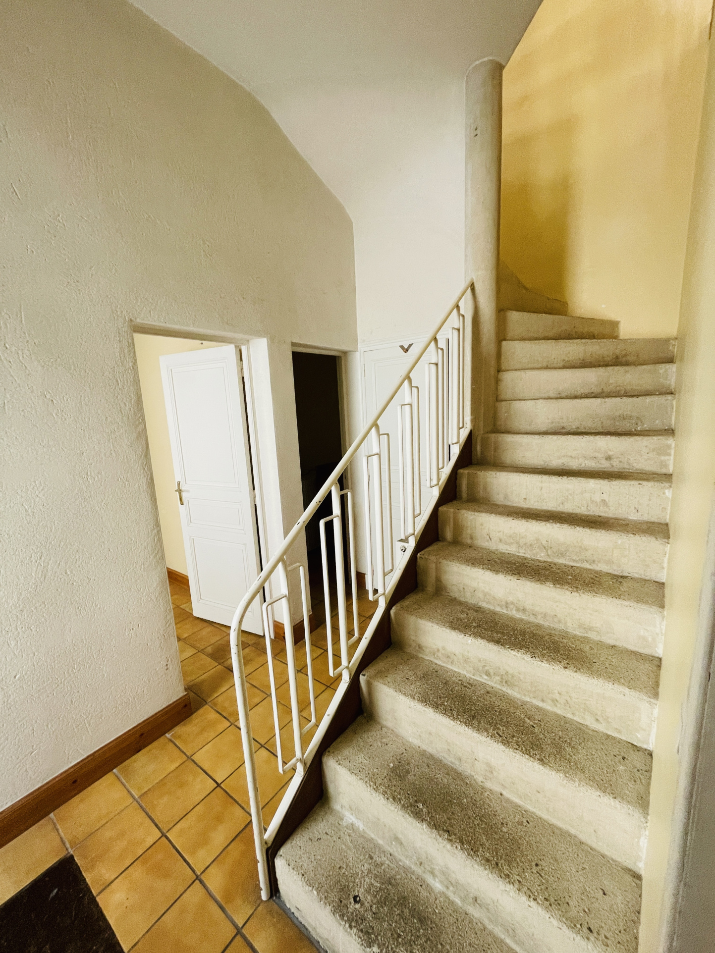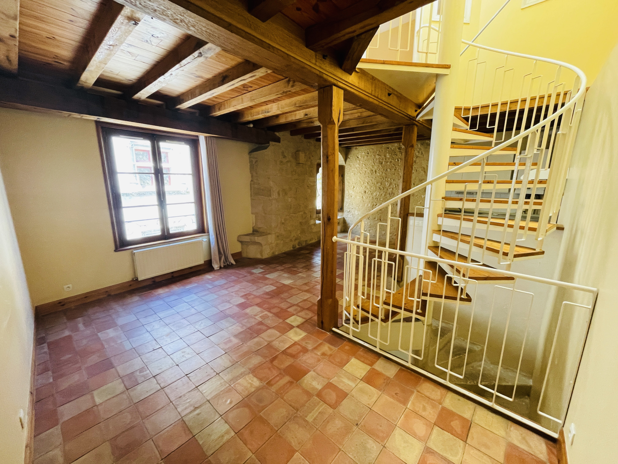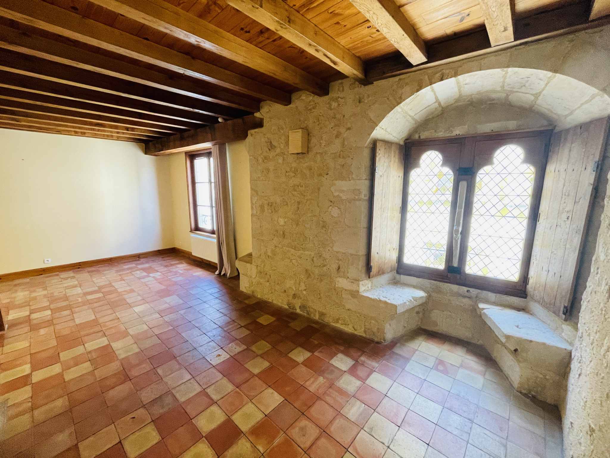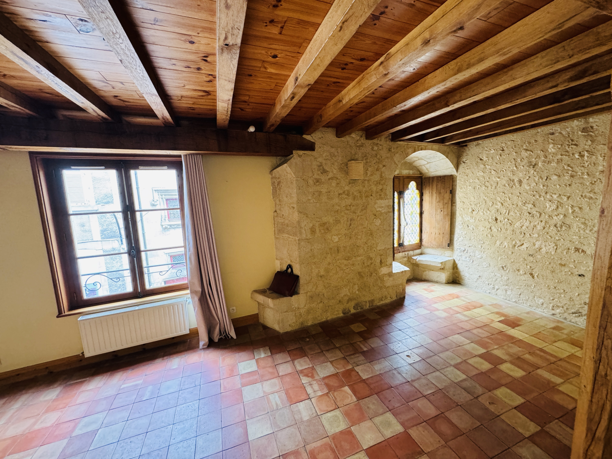Au premier étage un séjour plein de charme de 30m² sur tomettes anciennes avec un coin cuisine entièrement équipé et aménagé (gazinière, lave-vaisselle, réfrigérateur et congélateur inclus dans la vente).