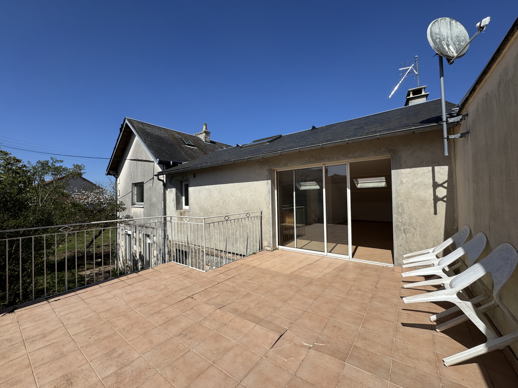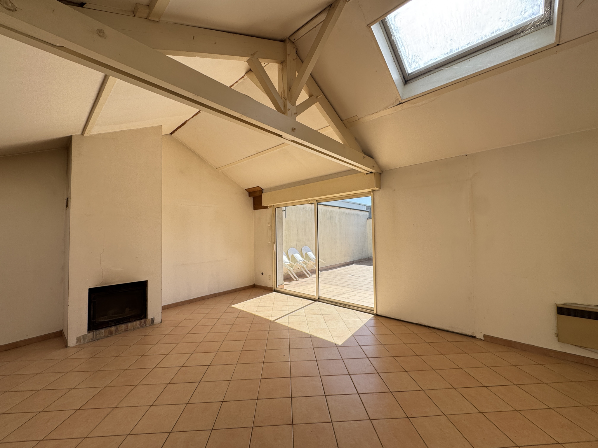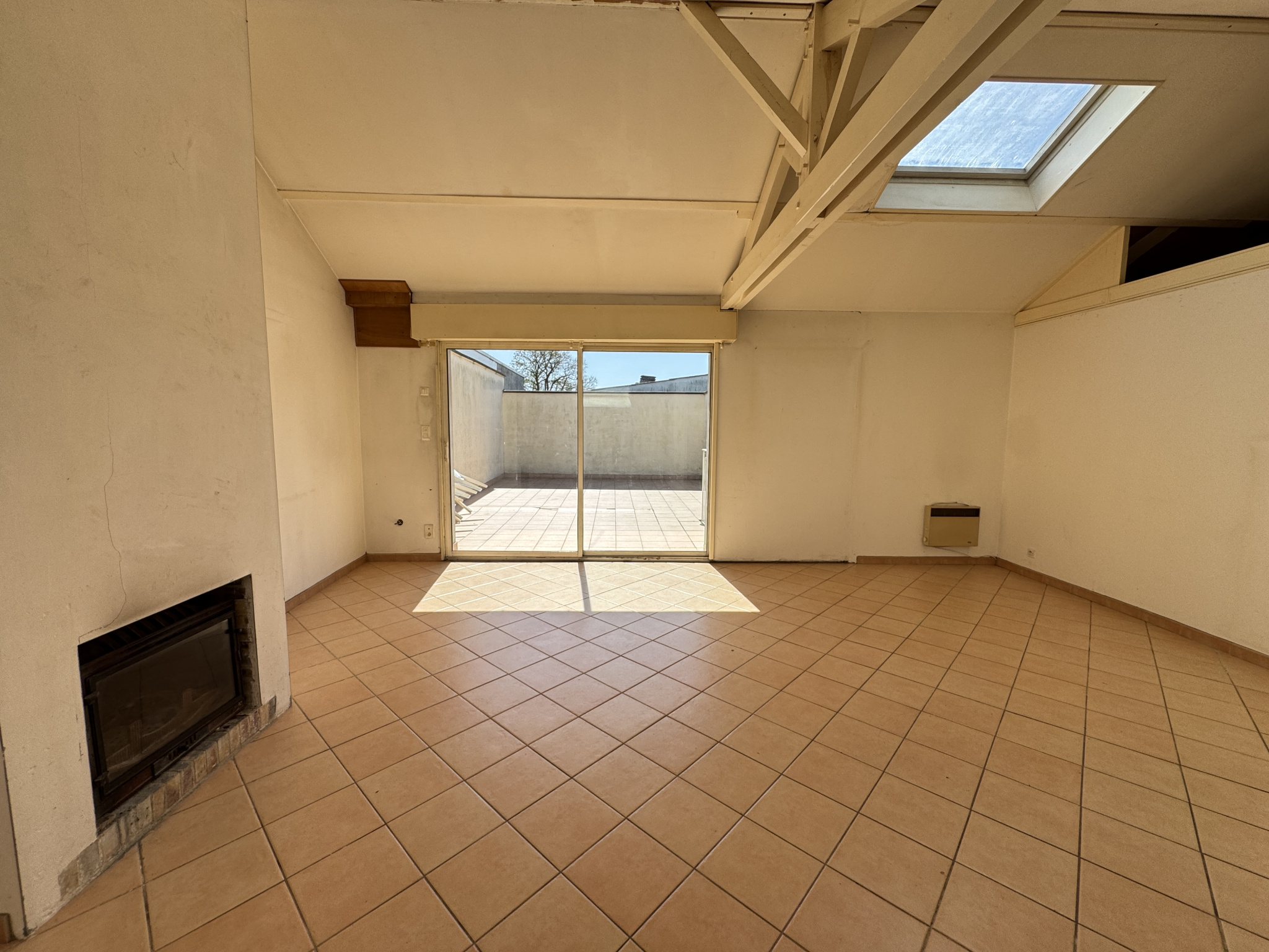 - Séjour sur carrelage de 37m² éclairé par 3 velux et une baie vitrée coulissante ouvrant sur une terrasse carrelé de 36m², cheminée insert.
