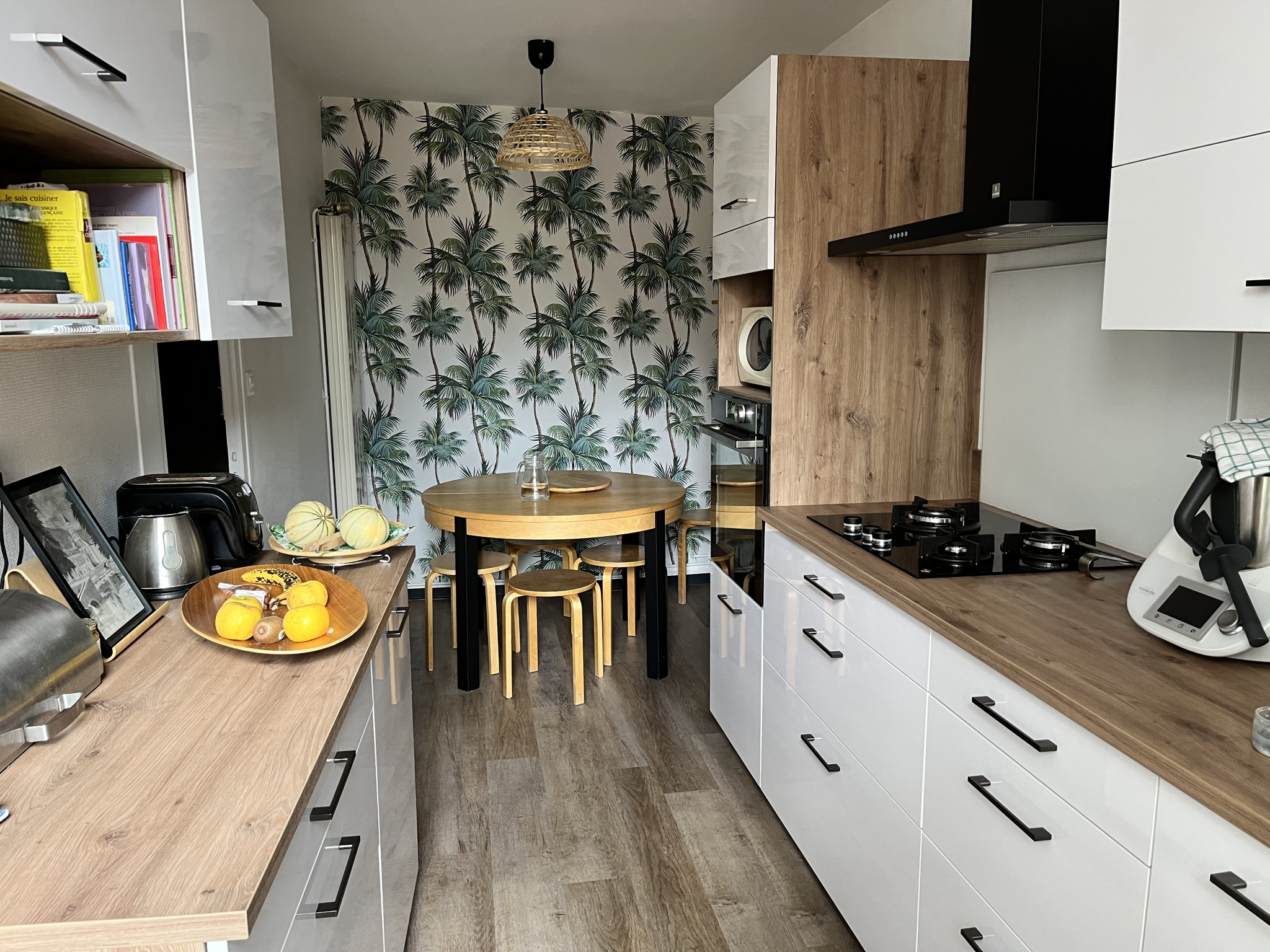 aménagée et équipée, avec espace repas, élément haut et bas, plaque de cuisson, hotte, four, lave-vaisselle, évier, sol parquet stratifié