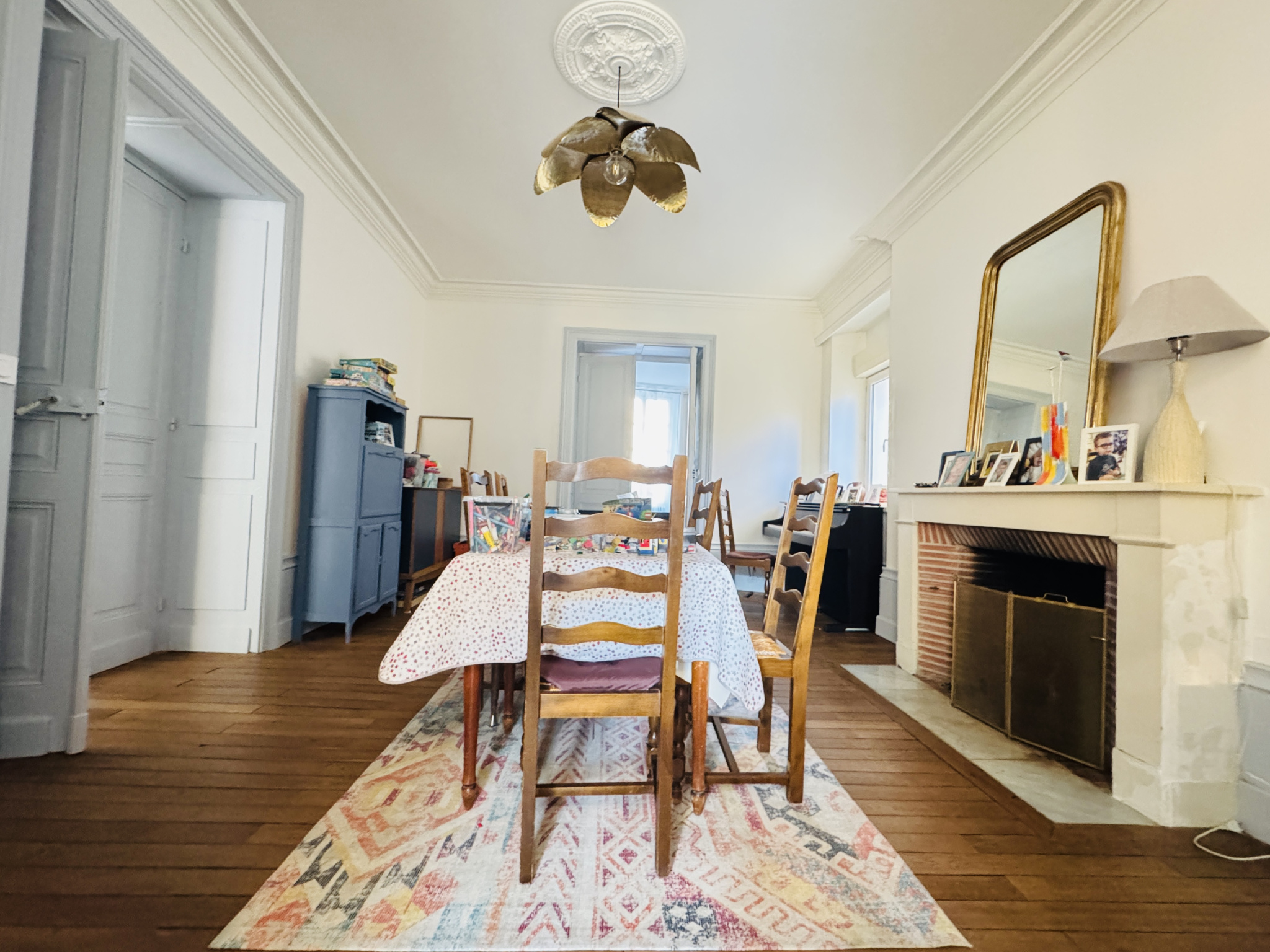 Elle comprend au rez de chaussée: un hall d'entrée desservant un salon sur parquet avec cheminée, une salle à manger puis une cuisine très lumineuse donnant sur la cour et le jardin.