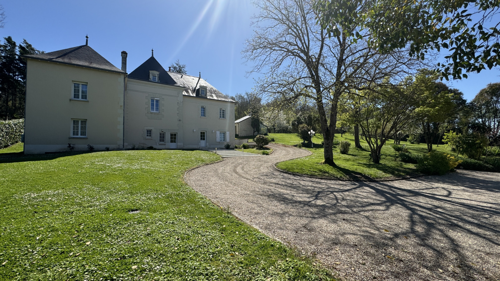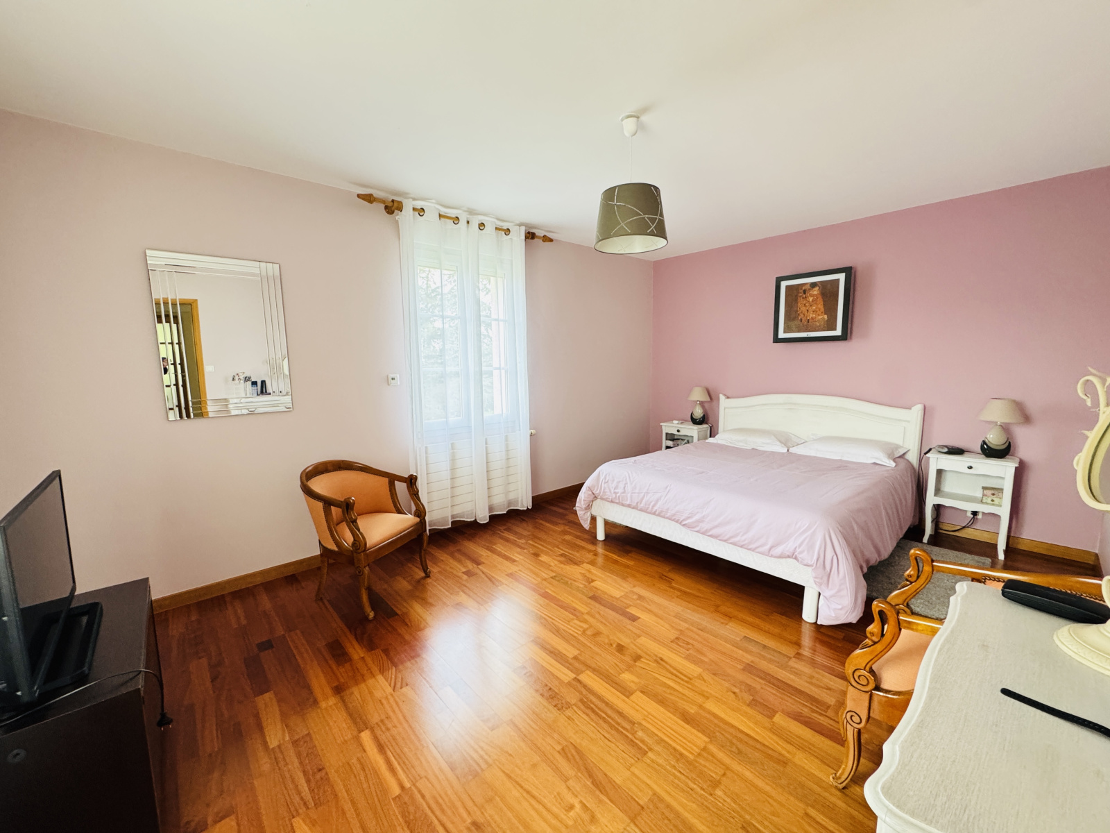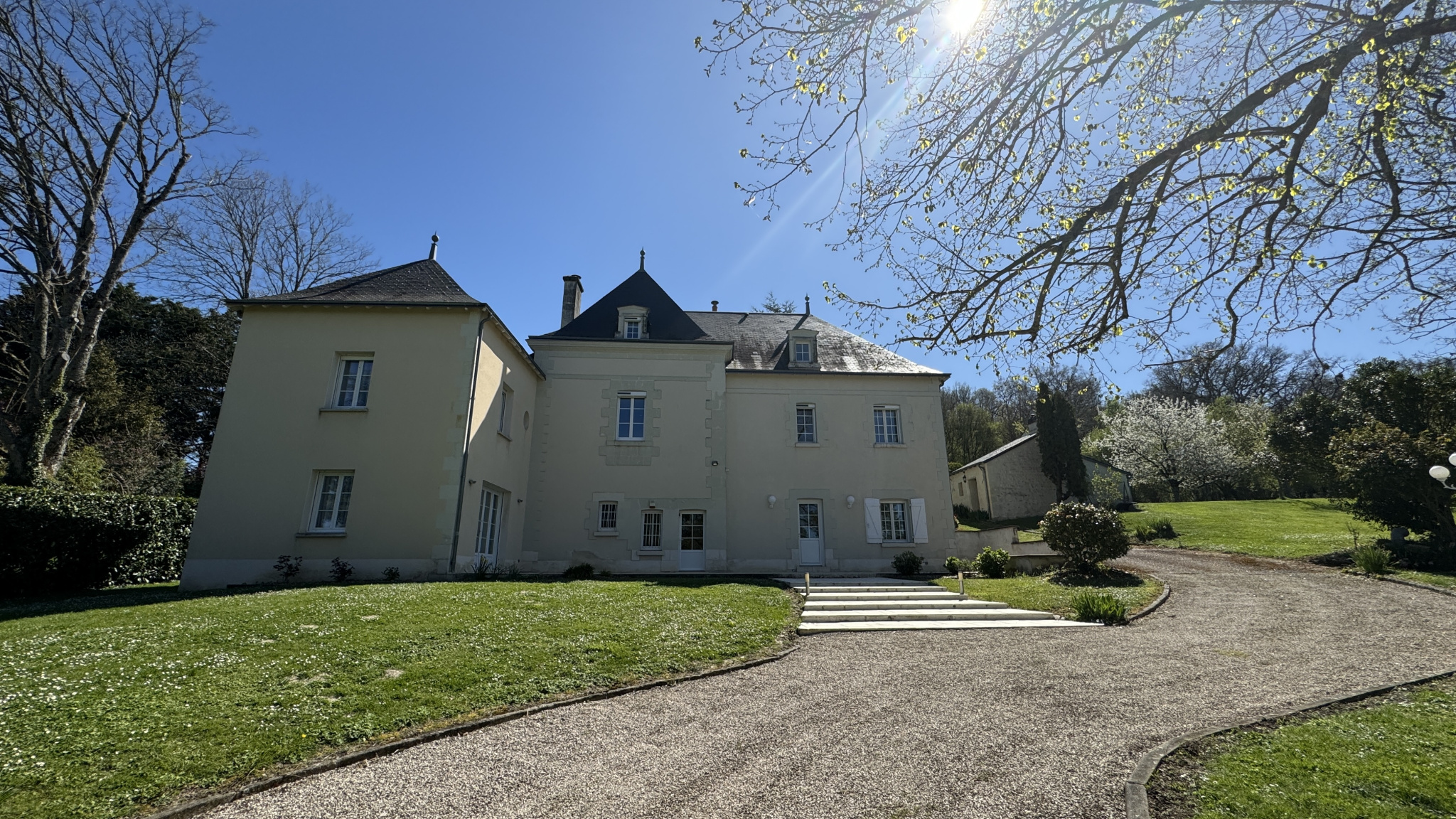 Implantée au milieu d'un parc de 7000m² avec une vue dégagée sur la campagne, elle offre de beaux volumes que ce soit dans les pièces de réception (salon de 42m², salle à manger de 30m²) ou dans les 5 chambres.
