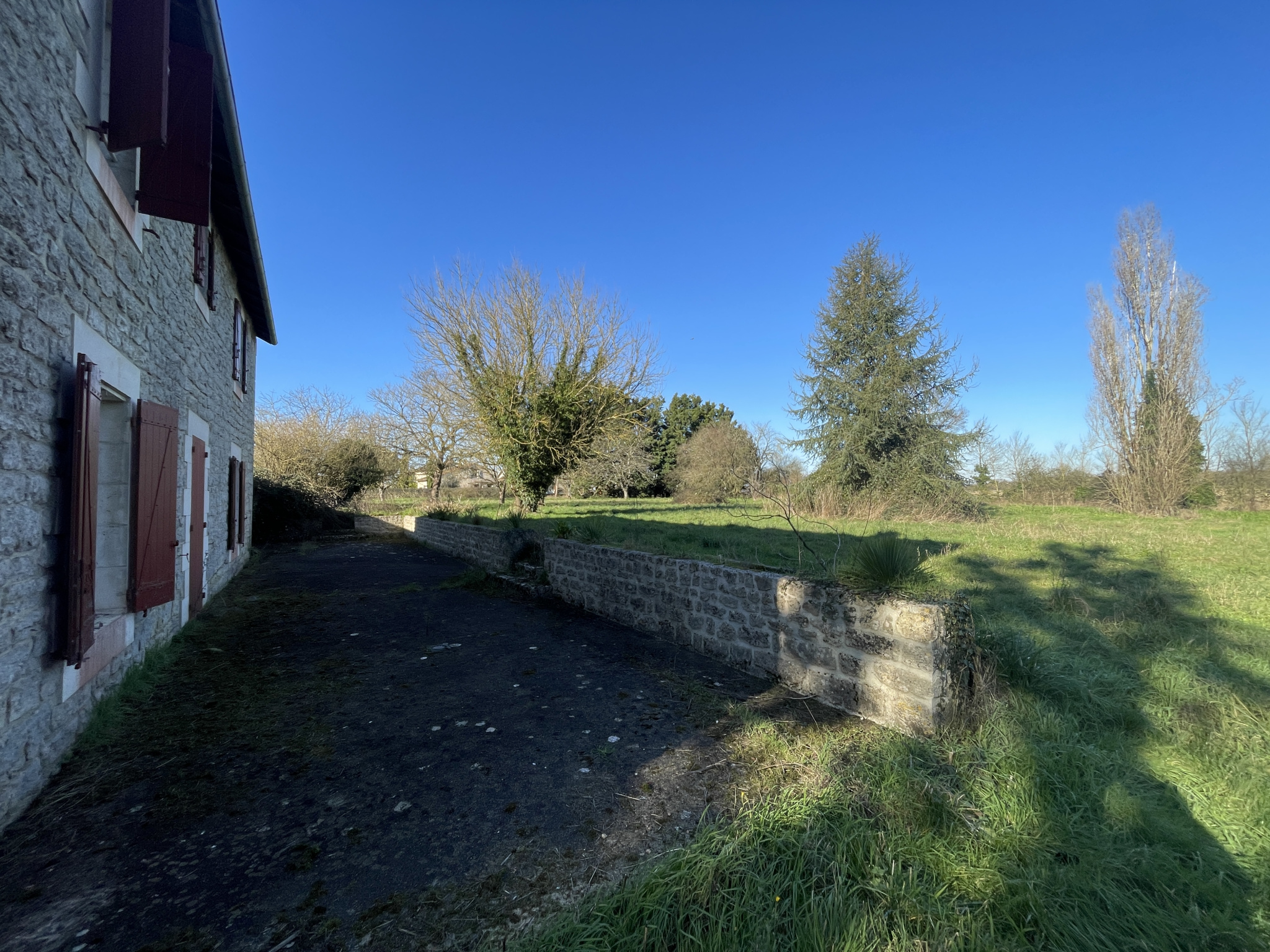 Un beau terrain gazonné et arboré sans trop de vis-à-vis avec une cour d’accueil sur graviers